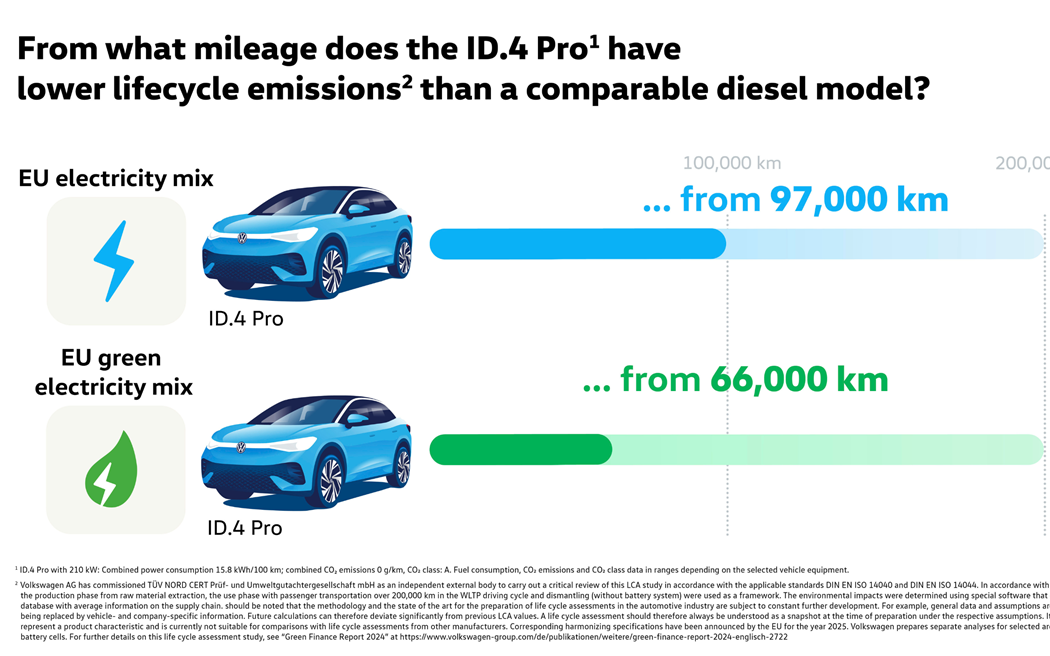 Especificamente, a comparação acima mencionada indica que um ID.4 Pro conduzido de forma consistente utilizando a mistura da rede de eletricidade verde da UE tem uma pegada de carbono mais baixa após cerca de 66.000 km, o mais tardar. Este ponto é atingido em cerca de 97.000 km com a mistura convencional da rede elétrica da UE.