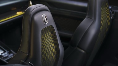 O destaque do interior é o icónico tecido com padrão Pasha em Preto/Azeitona Neo. O design gráfico do tecido faz lembrar a bandeira axadrezada em movimento. Os retângulos de diferentes tamanhos, dispostos de forma inteligente, criam uma espécie de movimento no padrão. Em vez de veludo jacquard, tal como era utilizado no passado, o 911 Spirit 70 combina um tecido com “flock yarns”. Esta solução confere ao tecido um carácter ainda mais desportivo, um toque melhorado e mais conforto, especialmente em viagens mais longas.