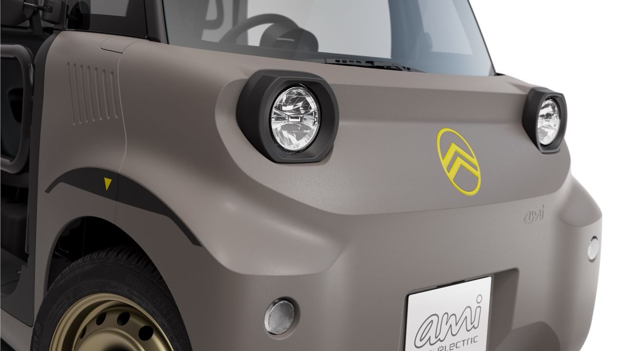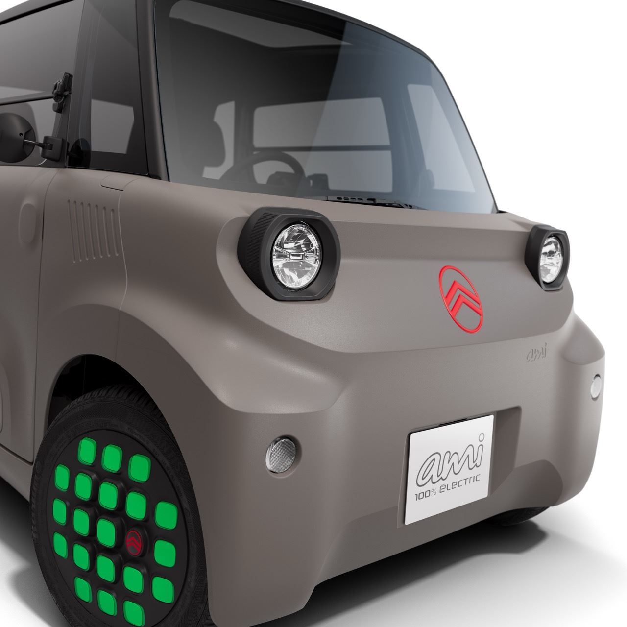 Os seus faróis são agora elevados na base do para-brisas e rodeados por uma decoração preta, o que lhe confere um aspeto mais expressivo e um novo equilíbrio na parte dianteira. Esses dois faróis estão ligados por uma nova forma de cápsula, onde se encontra o novo logótipo da marca num tom Rouge André. Esta nova cápsula, gravada no molde, assume a forma de um amplo sorriso, reforçando o lado jovial e benevolente do modelo. A parte inferior perde a sua redondeza a favor de arestas mais vivas e superfícies mais verticais, criando o para-choques nas laterais. À frente das rodas formam-se cubos que fazem lembrar peças de Lego, elementos que reforçam a perceção da largura de um Ami com melhor colocação na estrada e que contribuem para o seu carácter. Funcionam como para-choques de proteção nos quatro cantos do Ami.