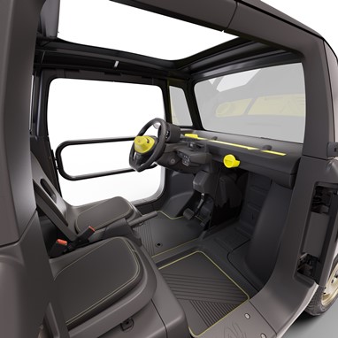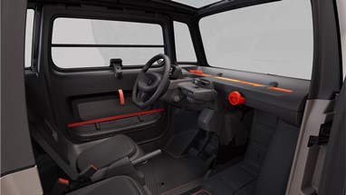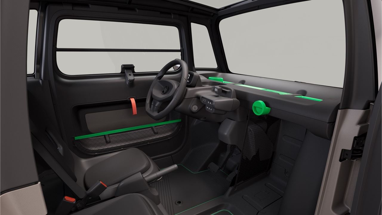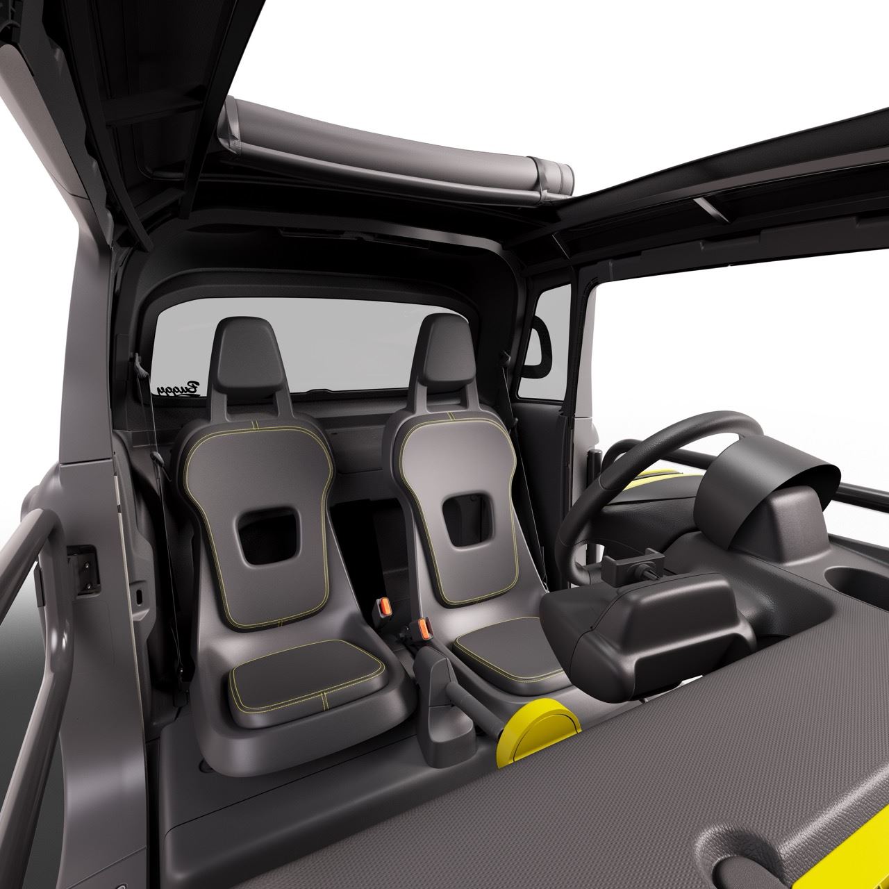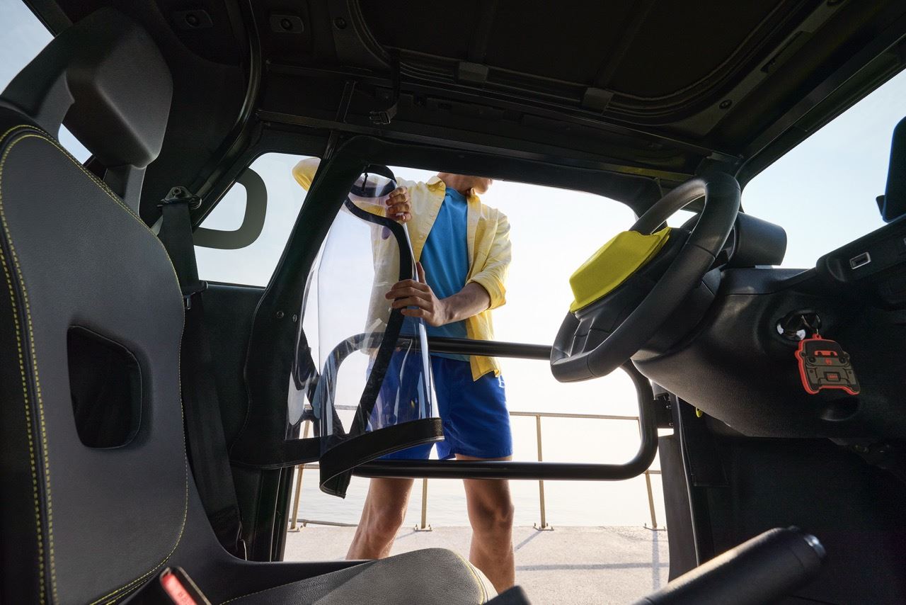 As portas são substituídas por aros metálicos pretos, montados em dobradiças, acentuando a sensação de contacto com o mundo exterior. No entanto, estão disponíveis, como acessórios, coberturas de portas com fecho de correr para isolar os ocupantes das intempéries. Estas podem ser enroladas e guardadas facilmente quando não estão a ser utilizadas. O teto de abrir está protegido por uma capota, que é também muito fácil de manusear para conduzir o Buggy com os cabelos ao vento.