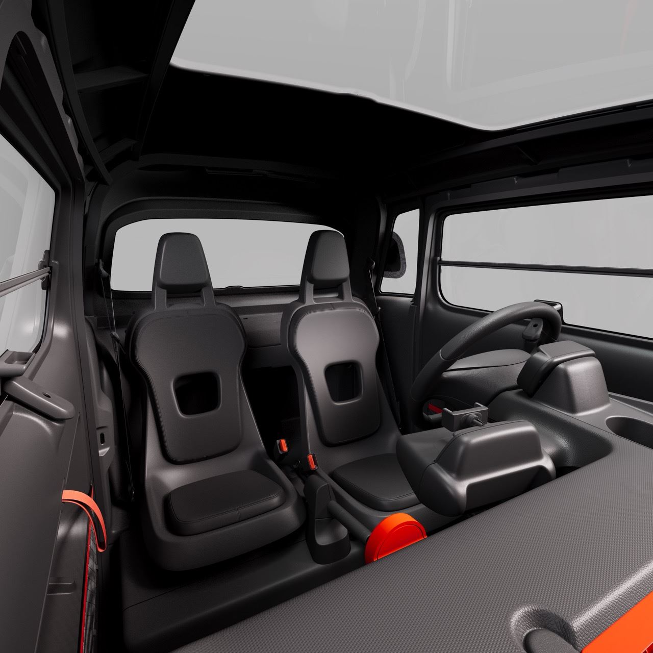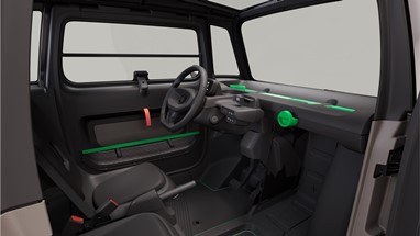 - Em termos de conforto: 3 caixas de arrumação coloridas para instalar no painel de bordo, 1 gancho para malas colorido para o lado do passageiro, 1 conjunto de 2 tapetes coloridos, 1 conjunto de 2 redes coloridas para as portas, 1 rede de separação central.