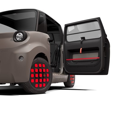 - Em termos de design exterior: 4 embelezadores de cor para as jantes, 1 conjunto de stickers para afixar na cápsula da soleira da porta e no vidro traseiro. É de notar que a noção de formas fechadas mencionada na frente também se reflete em várias assinaturas gráficas que se encontram na lateral do Ami. É o caso, por exemplo, dos embelezadores das rodas, num padrão axadrezado de quadrados com cantos arredondados, ou do sticker no painel traseiro. Estas formas são muito contemporâneas e podem ser encontradas em muitos mundos artísticos e das novas tecnologias. É um acenar do Ami às gerações mais jovens.