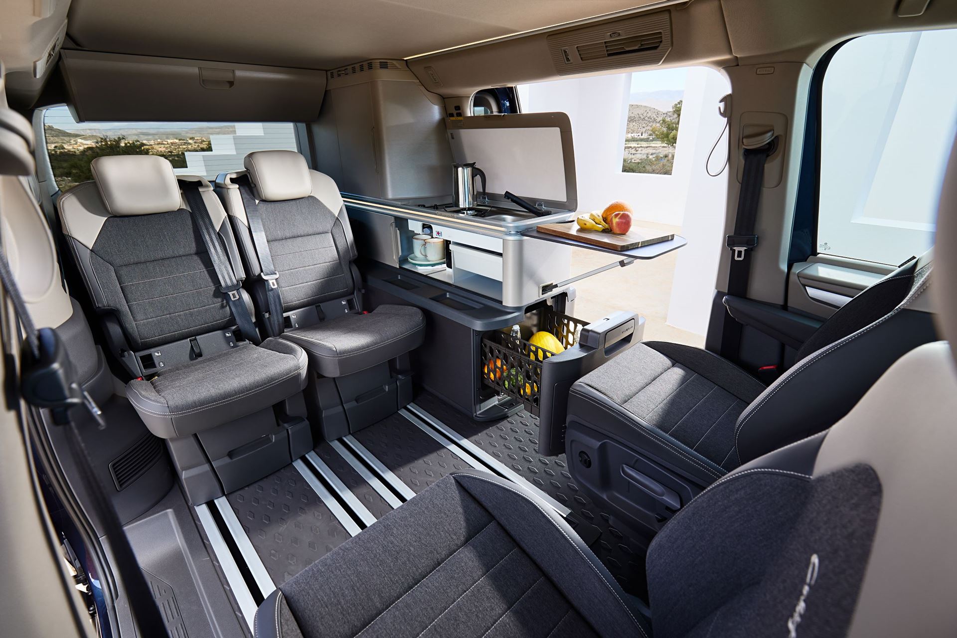 No entanto, o destaque é que a nova California também tem uma porta deslizante no lado do condutor, que se abre para criar um espaço exterior adicional. Uma vez que a cozinha e o frigorífico – que também podem ser acedidos do exterior – estão localizados deste lado, esta área provavelmente será usada para refeições ou para passar as horas da noite, quase como um terraço. Para maximizar a versatilidade, o toldo pode ser encomendado para o lado direito ou esquerdo do veículo. Se o lado da cozinha for usado para o toldo, por exemplo, pode ser montado um pano de sol à direita para abrir esta área para jogar ou ler à sombra. Não há dúvida de que a opção de utilizar o veículo como um monovolume para o dia-a-dia ou como uma versátil autocaravana para lazer foi agora ainda mais melhorada graças às duas portas deslizantes.