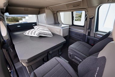 Este conjunto traz muitas vantagens: continua a haver espaço para entrar e sair da porta deslizante à esquerda, os condutores maiores têm consideravelmente mais espaço para um ajuste ótimo do banco, o banco do condutor ajustável em altura pode agora também rodar completamente em 180 graus; e é criado espaço para o frigorífico, que abre para a frente como uma gaveta, como na Grand California. Assim, este último pode não só ser utilizado de forma mais eficaz, como também pode ser operado a partir do exterior do veículo para carregar e descarregar o pequeno-almoço ou bebidas frescas.