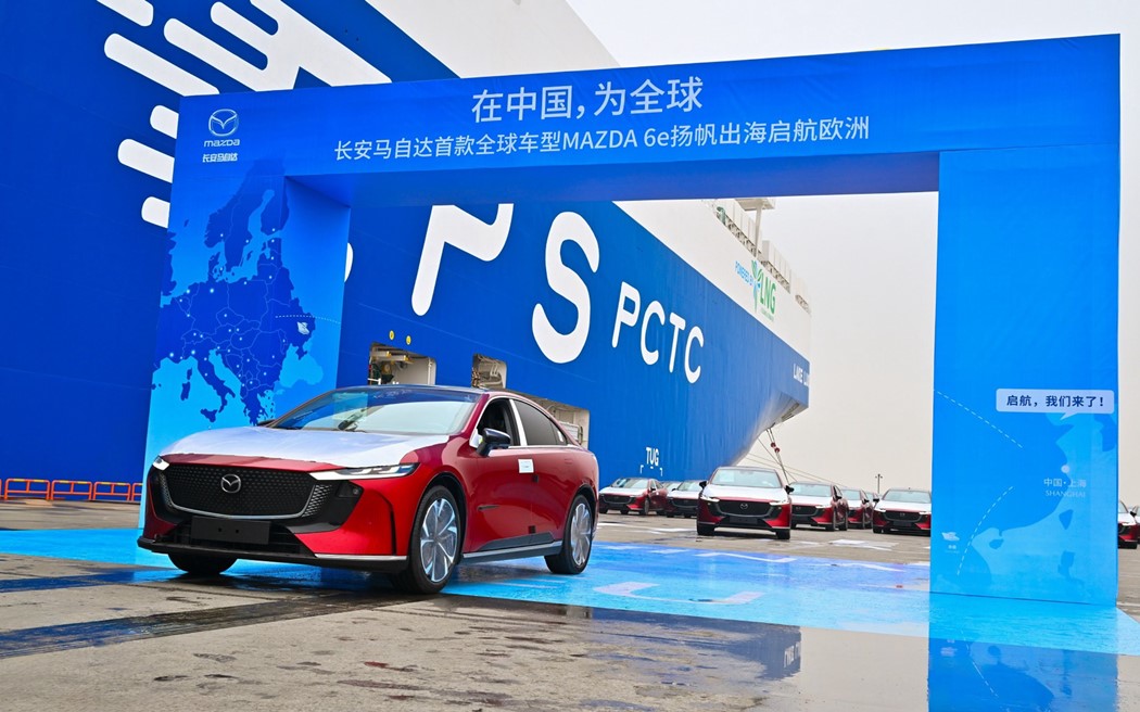 Foi do porto de Waigaoqiao, em Xangai, na China, que a 22 de abril último saíram para os mercados da Europa as primeiras unidades do novo Mazda6e, hatchback de 5 portas 100% elétrico que o mundo ficou a conhecer em Janeiro último, fruto da sua estreia no Salão Automóvel de Bruxelas. Foi pelas 10h00 da manhã desse dia que se deu início ao embarque do primeiro lote de 600 Mazda 6e, saídos do alinhamento ordenada que tinham ao lado do gigantesco supercargueiro ro-ro ali ancorado. Accionado o botão de embarque, a primeira unidade do novo Mazda 6e seguiu para o seu interior, sob uma chuva de aplausos das entidades presentes no local, testemunhando o arranque oficial deste processo, não só da Direcção da Changan Mazda Automobile Co., Ltd., como também de representantes do Comité de Gestão do Distrito de Lingang e demais parceiros logísticos.