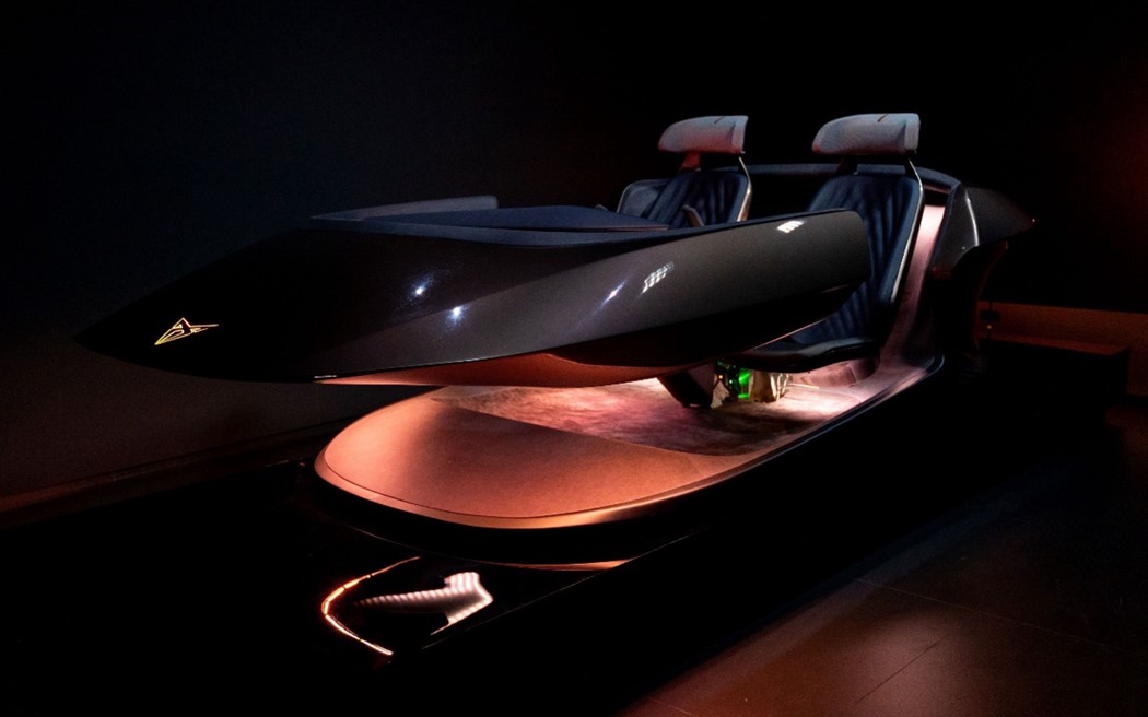 Luz e som como materiais palpáveis. A experiência é moldada por luz e som, com destaque para um novo elemento central: um prisma que representa “a alma do automóvel. É o componente que orquestra toda a experiência; tudo parte daí”, descreve a designer.