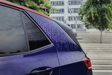 Design exterior exclusivo. O elemento mais distintivo do exterior do ID.3 GTX FIRE+ICE é a sua pintura Ultra Violet Metallic. Este esquema de cor único presta homenagem ao lendário Golf antecessor, que esteve disponível num tom semelhante. O friso do tejadilho reforça o caráter desportivo com a sua pintura anodizada em vermelho Flaming Red, enquanto o pilar C exibe um decalque mate transparente com o padrão geométrico FIRE+ICE. O spoiler do tejadilho inclui o logótipo Fire and Ice dos anos 90, reforçando a ligação ao modelo original. Outro destaque visual é o conjunto de jantes “Locarno” de 20 polegadas, que sublinha a presença dinâmica do modelo com pintura anodizada Ultra Violet Metallic, acabamento polido de alto brilho e um centro de roda em vermelho GTX. Os farolins traseiros LED de última geração possuem um escurecimento exclusivo para esta edição especial, reforçando o caráter premium e desportivo do modelo. Outro pormenor diferenciador são as projeções luminosas no solo ao abrir as portas, exibindo gráficos alusivos aos elementos fogo e gelo, respetivamente no lado do condutor e do passageiro.