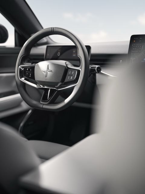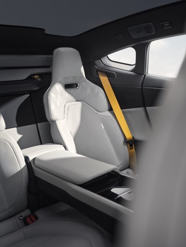 Materiais de fibra natural são utilizados em todo o interior, evidenciados pela trama exclusiva Polestar desenvolvida com BCompTM nos encostos dos bancos dianteiros. Equipada com ampliTexTM para maior resistência, esta alternativa de base biológica à fibra de carbono, feita de linho, é até 40% mais leve que o plástico e utiliza 50% menos materiais de origem fóssil. As seções inferiores das portas, feitas com NFPP, exibem a estrutura natural do material de base biológica. Isso também pode ser observado no revestimento interno do porta-malas traseiro de 365 litros, enquanto o porta-malas dianteiro de 62 litros utiliza o material UltraSilent da AutoNeum, economizando 60% (aproximadamente 5 kg) de peso em comparação com o plástico tradicional e fazendo parte de uma estratégia de monomaterial para facilitar a reciclagem no fim da vida útil.