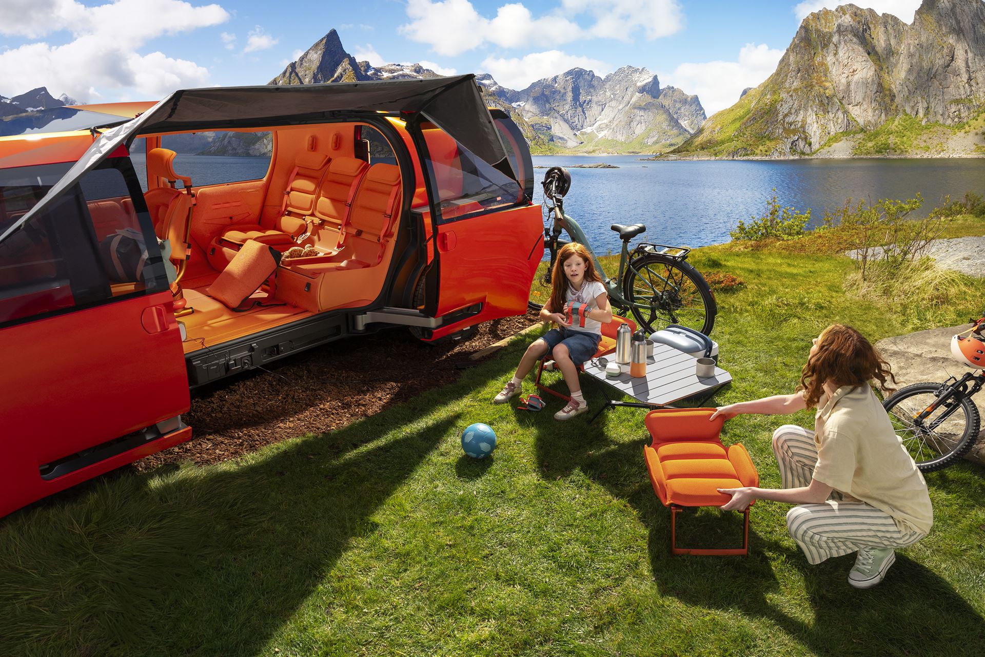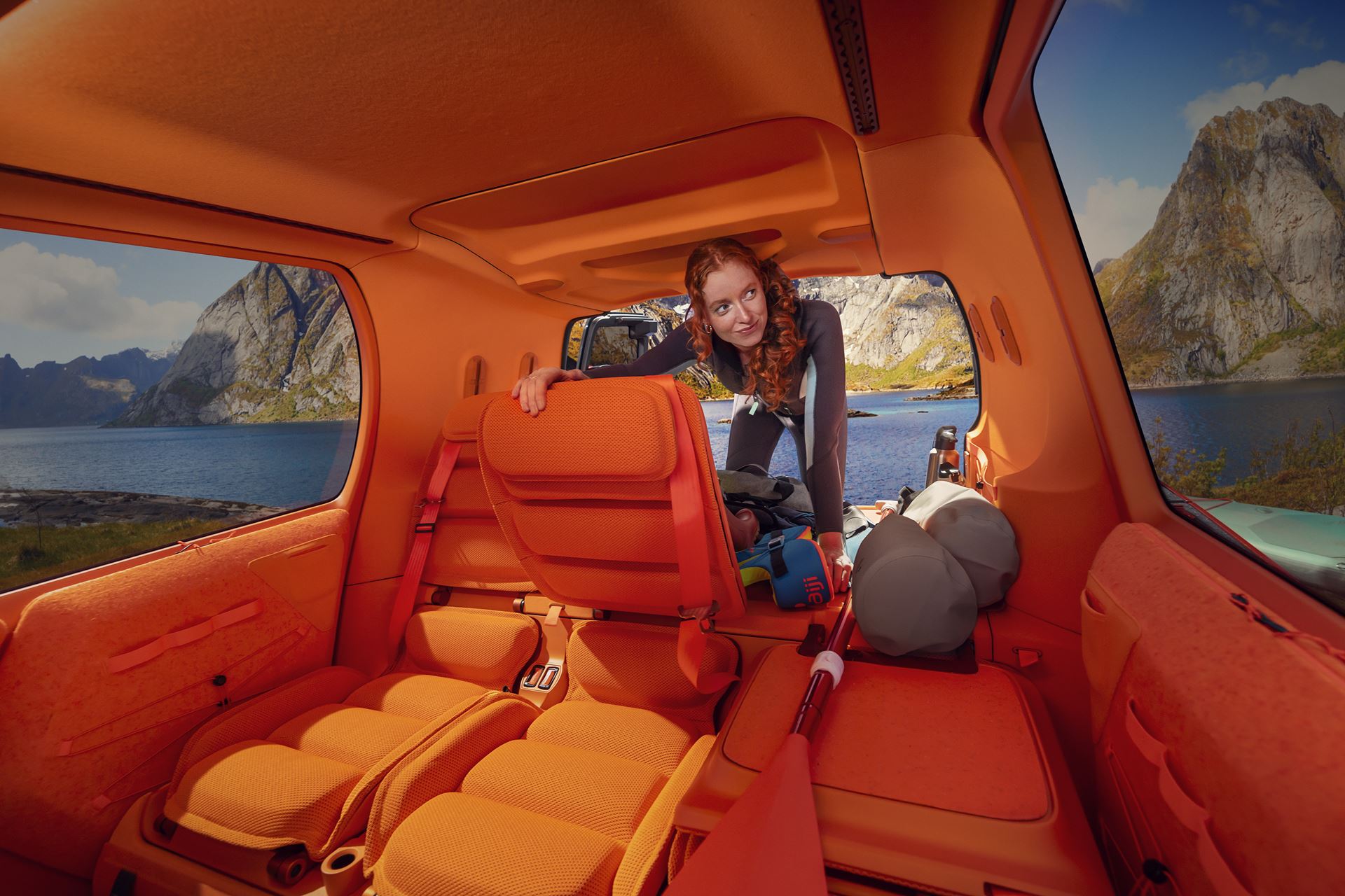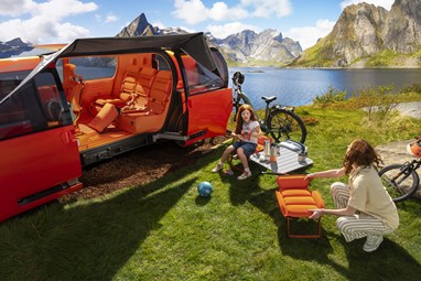 A segunda fila de bancos oferece três lugares, todos com a mesma largura e equipados com costas rebatíveis. Os três bancos traseiros são removíveis e podem ser convertidos em poltronas facilmente removíveis para uso como bancos extras ao ar livre. Dois bancos adicionais estão ocultos sob os bancos laterais da segunda fila. Estes desdobram-se com um simples movimento para se encaixar discretamente atrás do banco do condutor, em ambos os lados. O espaço para as pernas nestes dois bancos adicionais é generoso. Nesta configuração de seis lugares, o espaço da bagageira não é afetado, graças à engenhosa modularidade dos vários bancos. As quatro portas laterais abrem em direções opostas e a ausência de um pilar central proporciona um acesso fácil com uma largura de 1,92 metros. O piso completamente plano facilita a movimentação no interior, independentemente da configuração escolhida.