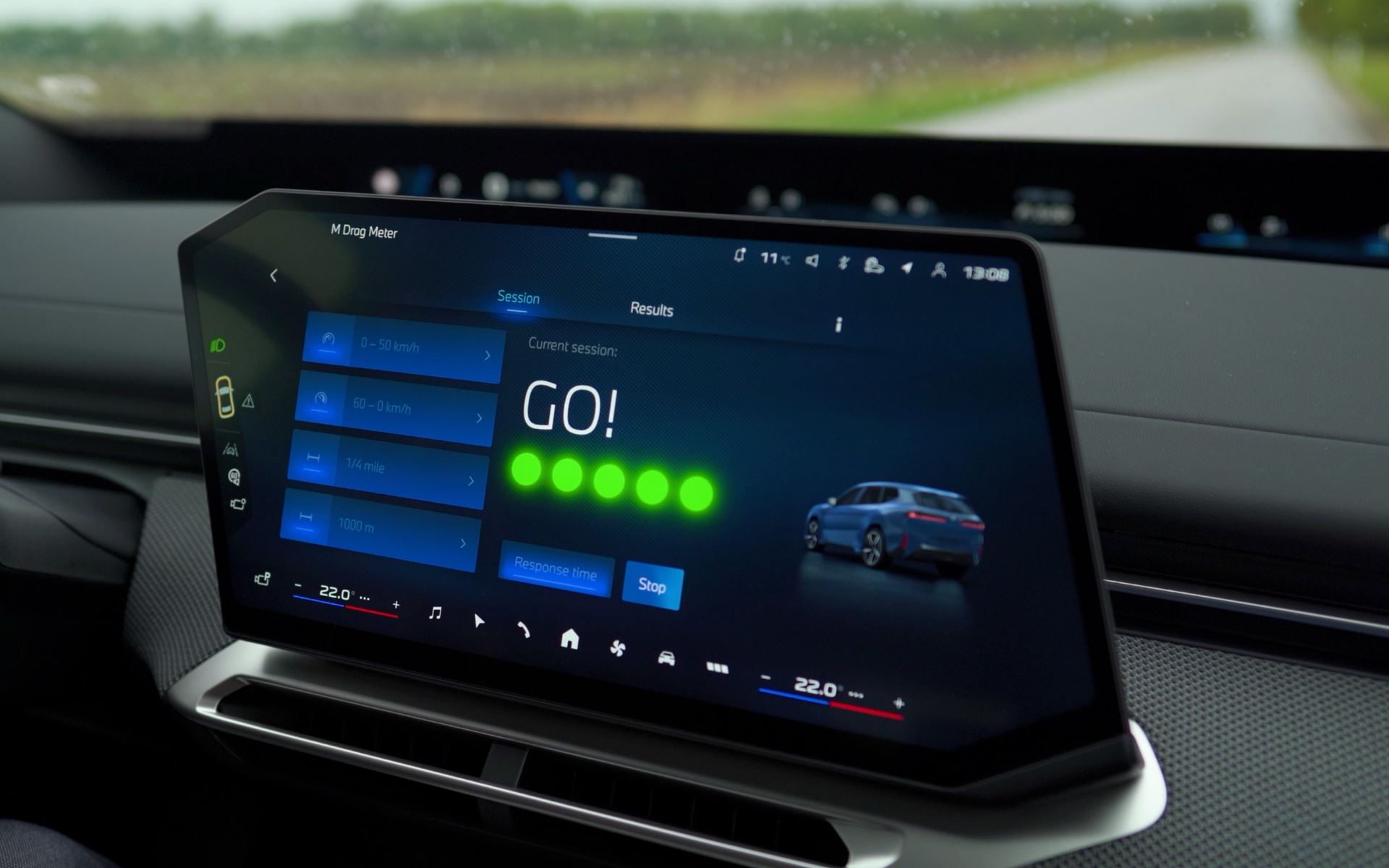 Apresenta valores específicos de aceleração e desaceleração, bem como o tempo de reação do condutor ao arrancar do ponto morto, diretamente no ecrã central. As medições de velocidade e distância suportadas por GPS constituem a base desta funcionalidade. Com opções de personalização de extensão, esta ferramenta integrada de medição de desempenho pode ser adaptada às necessidades individuais. Os condutores podem visualizar até quatro critérios de medição e os seus resultados simultaneamente no ecrã central.