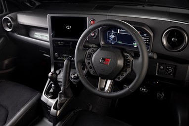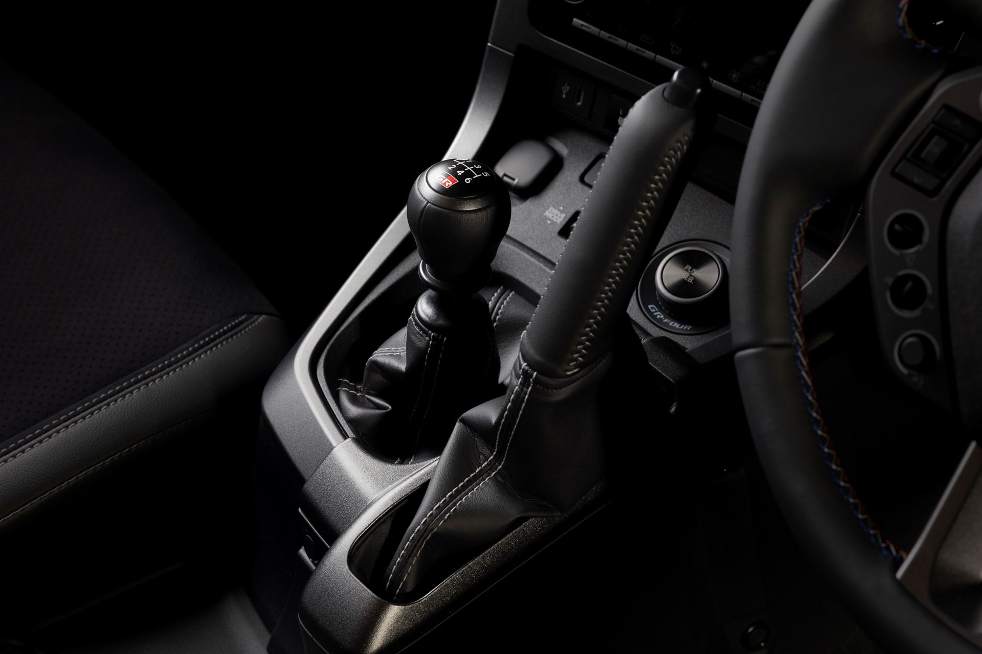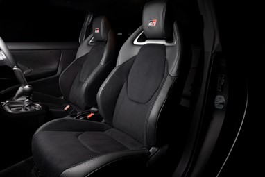 Pespontos vermelhos, azuis e cinzentos estendem o tema tricolor francês ao volante, que tem um diâmetro total menor e um layout de interruptores redesenhado, com base nas informações obtidas do carro de rali GR Yaris Rally2. O punho em pele exclusivo do travão de mão vertical apresenta costuras cinzentas, enquanto uma placa comemorativa com número de série celebra os títulos de Ogier. Há também gráficos de exibição dedicados para os modos «SEB» e «MORIZO» no ecrã TFT GR.