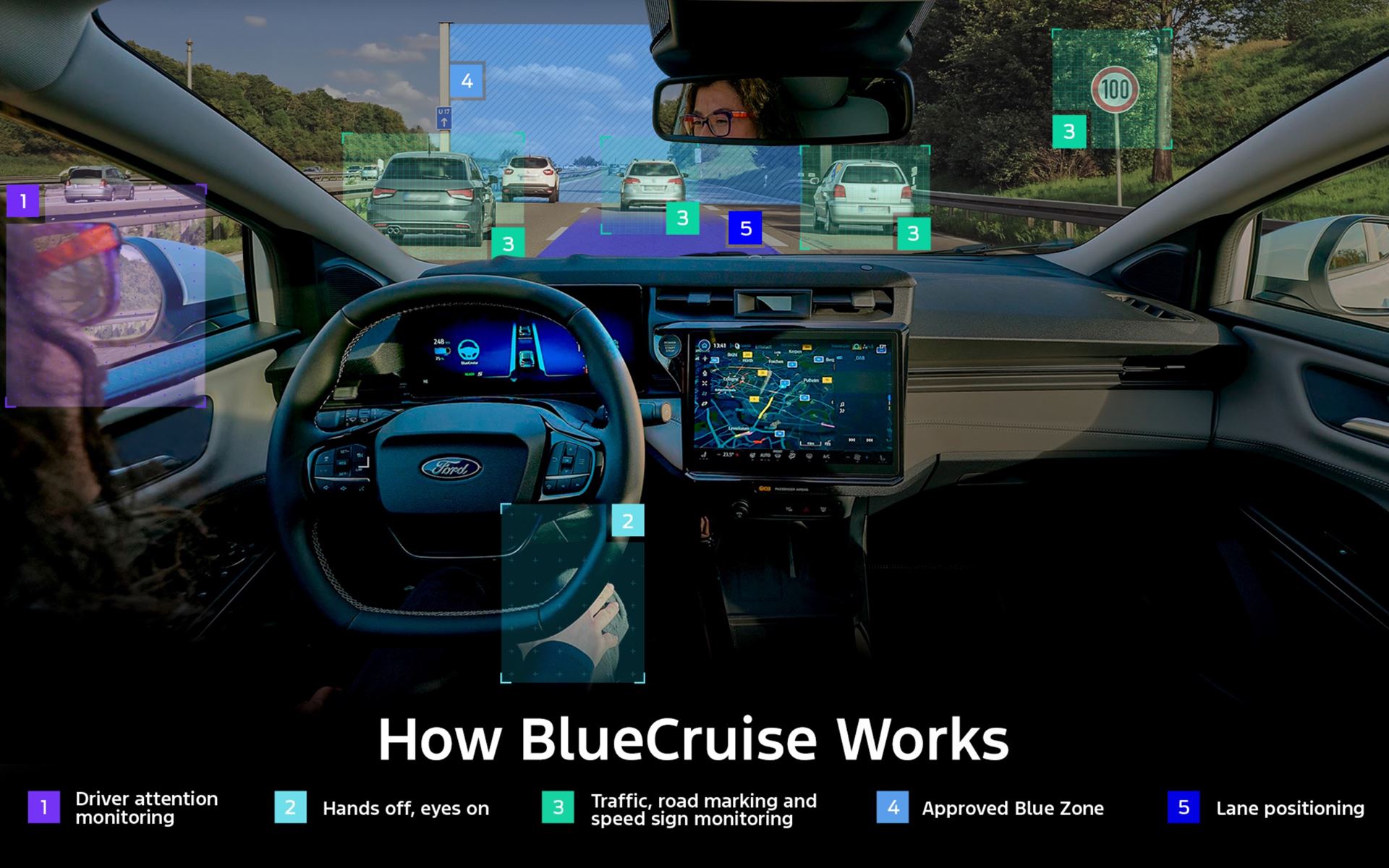 O BlueCruise é uma tecnologia “hands-off, eyes-on” (“sem mãos, olhos atentos”) que permite aos condutores tirar as mãos do volante quando viajam em autoestradas com zonas específicas designadas Blue Zones ("Zonas Azuis"). Estas zonas cobrem agora aproximadamente 95% das autoestradas em 16 mercados na Europa, proporcionando uma experiência constante em viagens de longa distância e deslocações internacionais.