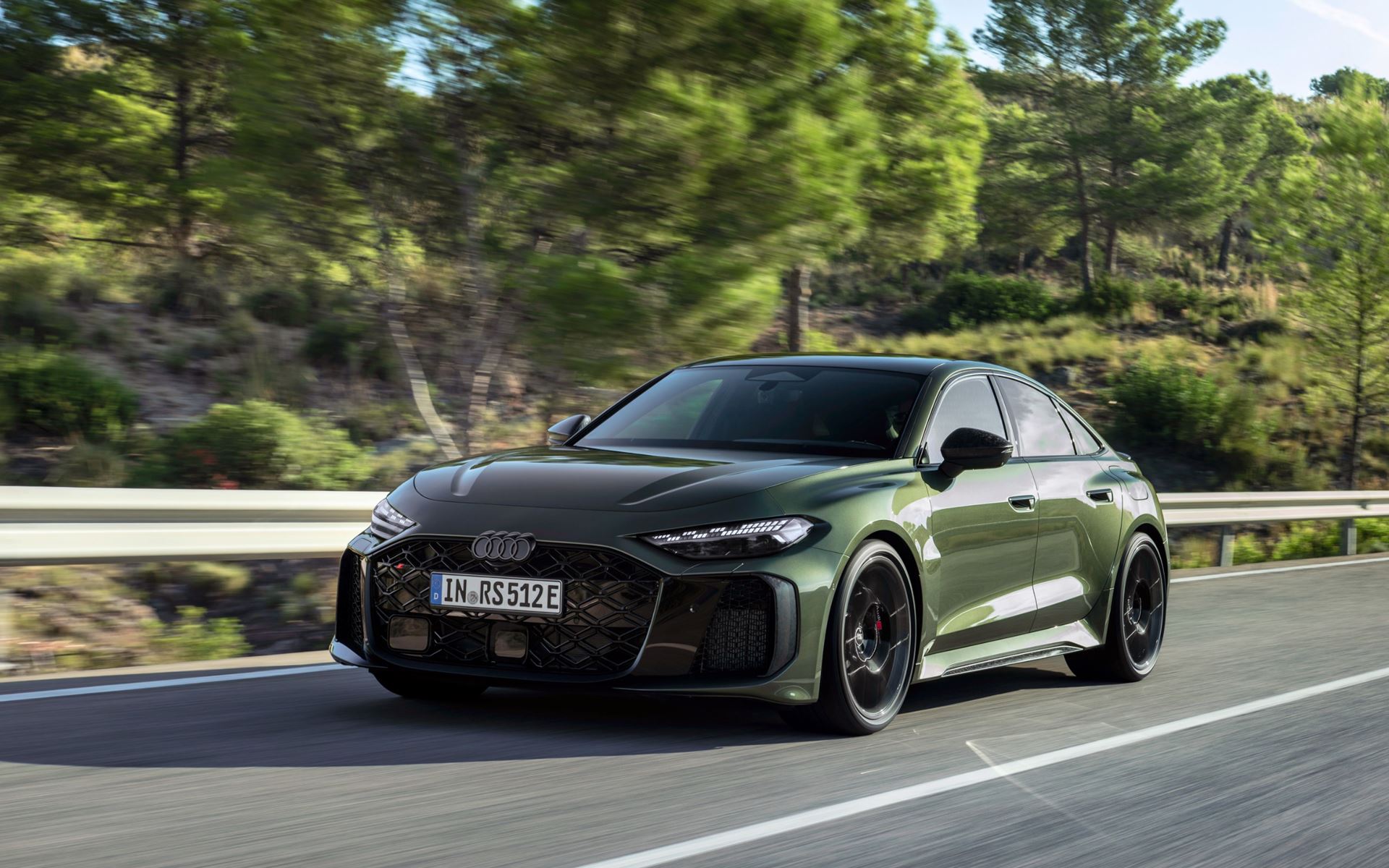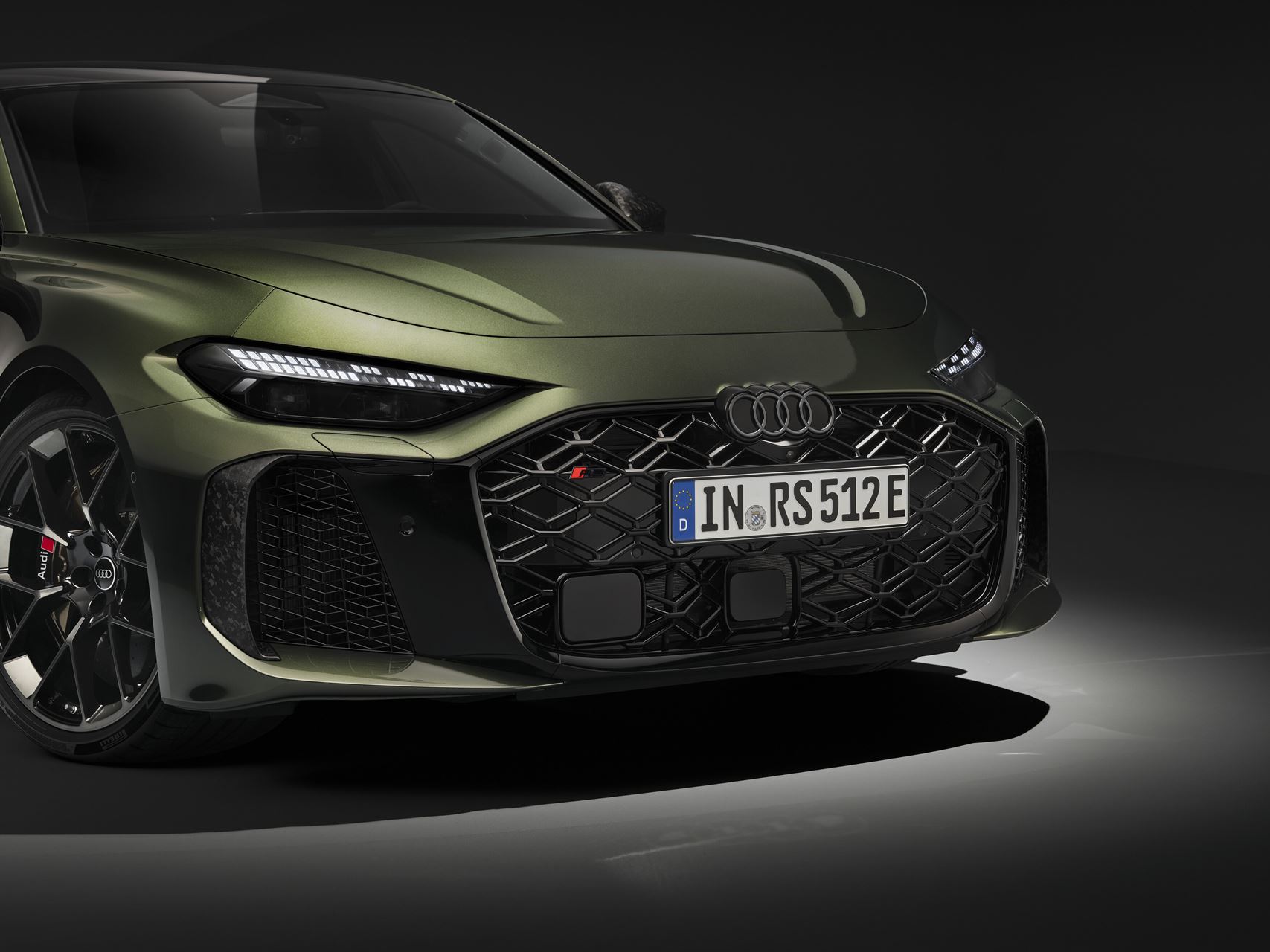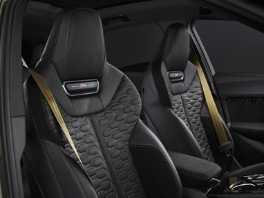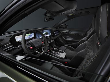 O pacote opcional Audi Sport para os novos RS 5 Avant e RS 5 Limousine é a expressão máxima da pureza desportiva. Acrescenta elementos exclusivos como para-choques dianteiro e traseiro específicos e jantes de 21 polegadas em preto phantom bicolor com corte diamantado e acabamentos mate. O sistema de escape RS Sport e a velocidade máxima elevada para 285 km/h garantem ainda mais performance. O interior exclusivo apresenta pela primeira vez costuras contrastantes em verde Serpentine e bronze. O pacote oferece também amplas opções de personalização, incluindo pintura metalizada verde Bedford. Travões RS cerâmicos com pinças em cor bronze e elementos em carbono mate completam o visual.