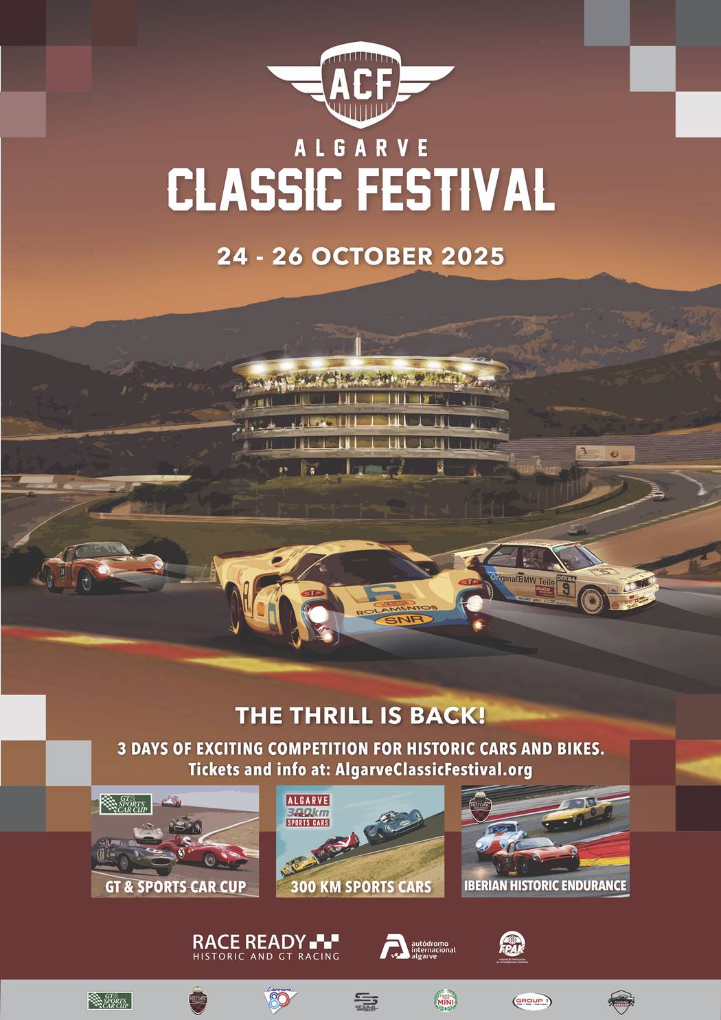 De 24 a 26 de Outubro de 2025, o Algarve Classic Festival volta a integrar o calendário de eventos organizados pela Race Ready, numa parceria estratégica com o Autódromo Internacional do Algarve válida para os próximos três anos. Organizado pela primeira vez em 2010, o Algarve Classic Festival decorre numa das regiões turísticas mais soalheiras da Europa e num dos circuitos mais emocionantes a nível mundial, o que faz deste evento um favorito tanto para os pilotos como para os seus acompanhantes. É também um dos maiores e mais relevantes encontros de carros históricos de competição da Península Ibérica, reunindo, em cada edição, mais de 300 automóveis e cerca de 500 pilotos oriundos de mais de 20 países.