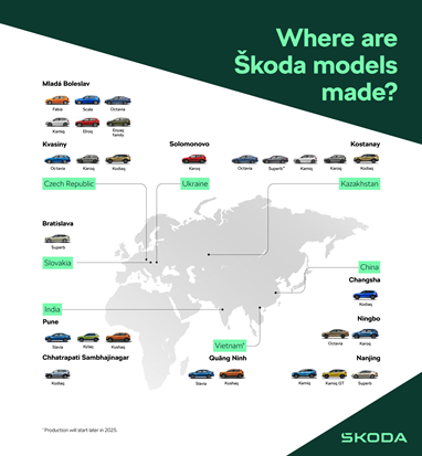 A marca também continuou a reforçar as suas operações internacionais: a capacidade da fábrica de Pune, na Índia, foi ampliada para o SUV compacto Kylaq, o terceiro modelo da Škoda fabricado na Índia para o mercado indiano. Além disso, foram finalizados os preparativos para a montagem de veículos no Vietname, e a produção do Kodiaq SKD foi iniciada no Cazaquistão.