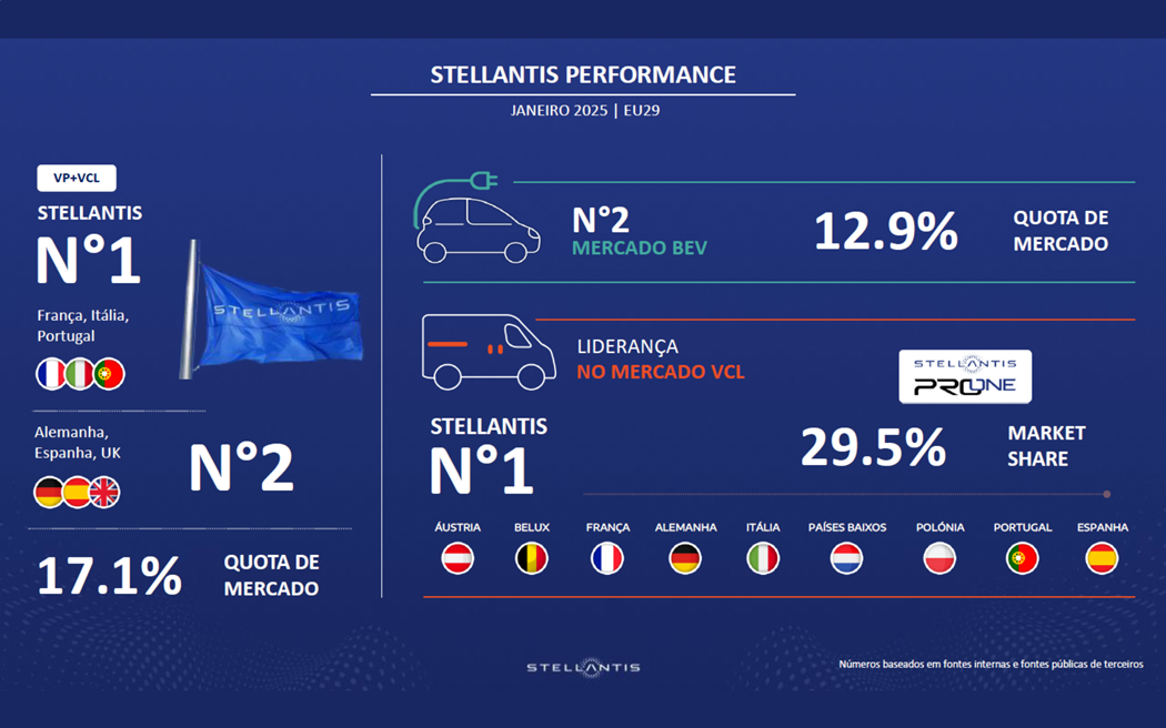 A Stellantis confirmou, no mês de janeiro, a sua segunda posição entre os OEM europeus no mercado total, mantendo a mesma quota de mercado – 17,1% – que detinha no final de 2024.