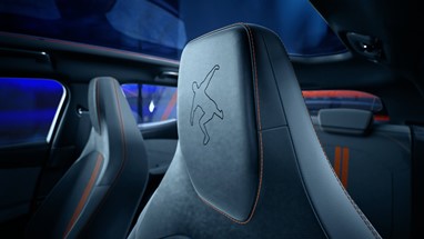Os bancos apresentam acabamentos Feeltek Luxury Grain com pespontos cor de laranja e riscas duplas Laranja Signal correspondentes às do exterior. Os tapetes personalizados são em camurça “nubuck” com costuras cor de laranja, enquanto o volante é revestido em couro com o raio central Laranja Signal.