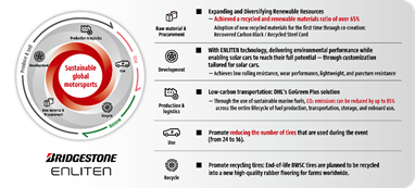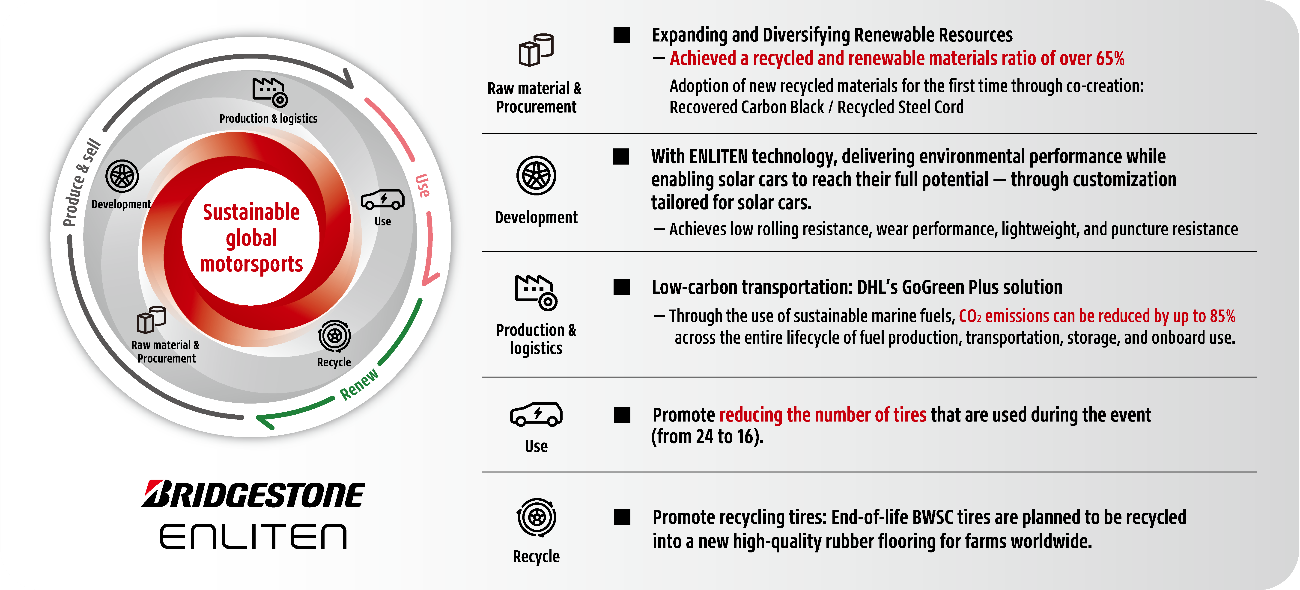 A Bridgestone Corporation, patrocinadora principal da mais prestigiada corrida de carros solares a nível mundial — o Bridgestone World Solar Challenge 2025 (BWSC), realizado na Austrália de 24 a 31 de agosto — forneceu pneus equipados com a tecnologia ENLITEN®, compostos por mais de 65% de materiais reciclados e renováveis. Esta foi a primeira vez que a Bridgestone aplicou negro de fumo recuperado e aço reciclado — desenvolvidos e produzidos em co-criação com parceiros — em pneus para o BWSC. Para além de reduzir o número de pneus utilizados durante o evento, a empresa implementou logística de baixo carbono e promoveu a reciclagem pós-uso.